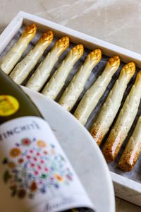 Combineer onze handgemaakte asperge bonbons, witte chocolade gevuld met een amandelpraliné, met de bekroonde Brabantse aspergewijn van 2026 'Tinchitè' voor een origineel cadeau wat indruk maakt!